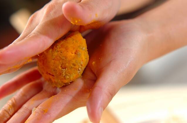 カボチャに(1)、<調味料2>の材料を加えて混ぜ合わせ、4~6等分(2人分)に分けて丸める。<衣>の小麦粉、溶き卵、パン粉を順につける。