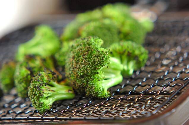 ブロッコリーは熱した網で、全体に焼き色がつくまで焼く。