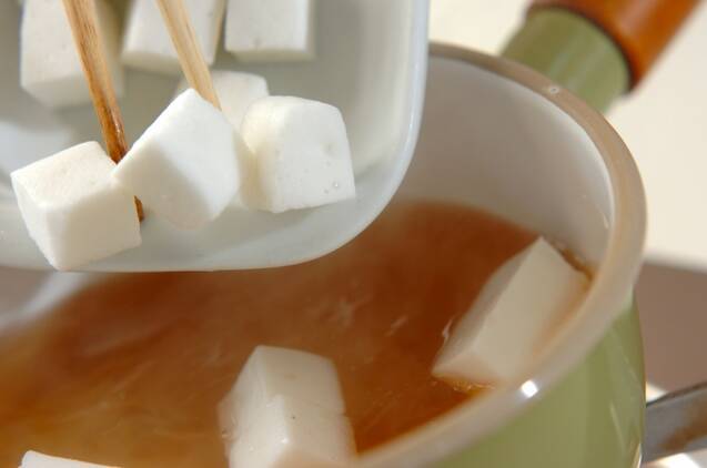 鍋にだし汁を入れて強火で熱し、煮たったら<調味料>の材料、ハンペンを入れる。