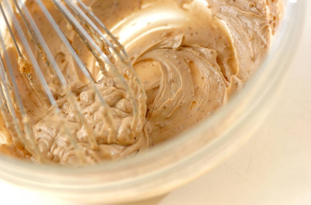 ボウルに無塩バターと黒糖を入れ、泡立て器でしっかり混ぜ合わせ、卵白を2回に分けて加え混ぜる。
