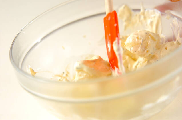 周りが白く粉をふいたようになったら、<ハーブマヨ>のボウルに加えて全体にサックリ混ぜ合わせ、器に盛り分ける。