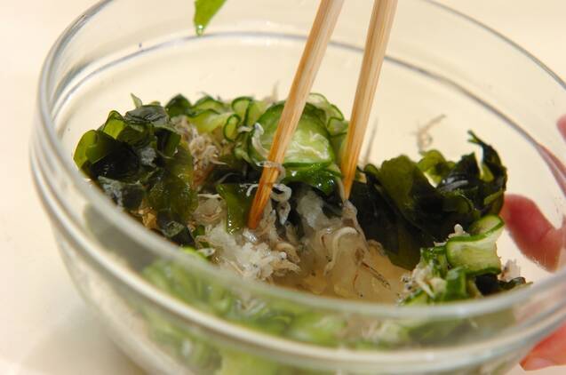 <おろし甘酢>のボウルにチリメンジャコとキュウリ、ワカメを加えて和え、器に盛る。