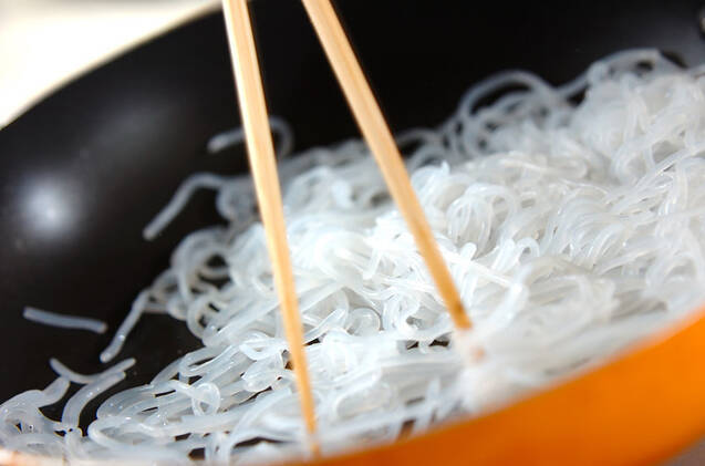 糸コンニャクは水気をきって食べやすい大きさに切り、サッと分量外の塩でもむ。熱湯で1分ゆでてザルに上げ、フッ素樹脂加工のフライパンで表面が乾くまで乾煎りする。