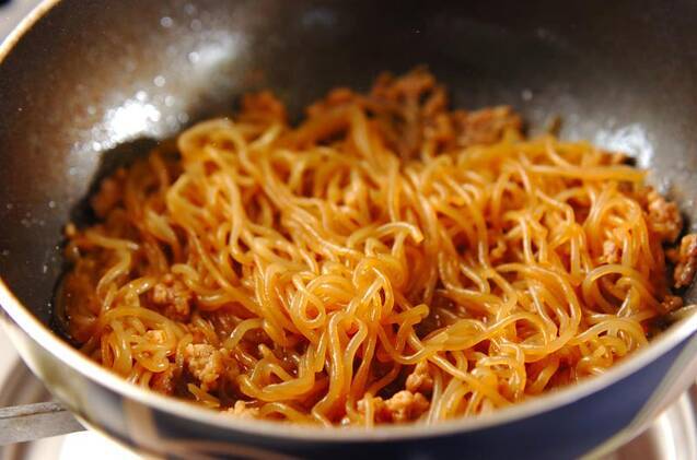 (2)のフライパンをサッと洗い、残りのゴマ油を熱して糸コンニャクを炒め、全体に油がまわったら(2)のひき肉を炒め合わせ、<調味料>の材料を加えて汁気がなくなるまで煮詰める。