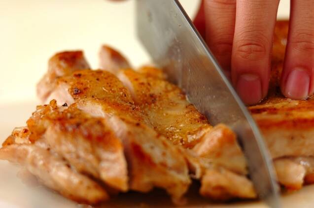 <チキンソテー>を作る。鶏もも肉の両面に塩コショウする。フライパンにサラダ油を中火で熱し、皮を下にして入れ、両面に焼き色が付くまで蓋をして焼く。取り出して5分程休ませ、幅2cmに切る。