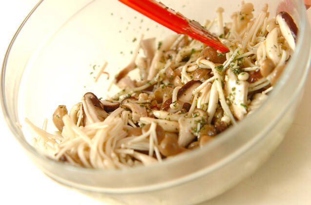 <ゆでるお湯>の材料を鍋に入れて強火にかけ、煮たってきたらキノコをサッとゆでてザルに上げる。ゆで汁をきり、<マリネ液>のボウルに加えて混ぜ合わせる。食べる直前まで冷やしておき、器に盛る。(ヒント)30分以上漬けておくと味がなじんでおいしいです。調理時間に漬ける時間は含まれていません。