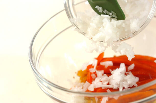 ボウルにニンニク、EVオリーブ油、ワインビネガー、バルサミコ酢、塩コショウを入れてよく混ぜ合わせ、赤パプリカ、黄パプリカ、玉ネギを加えて混ぜ合わせる。