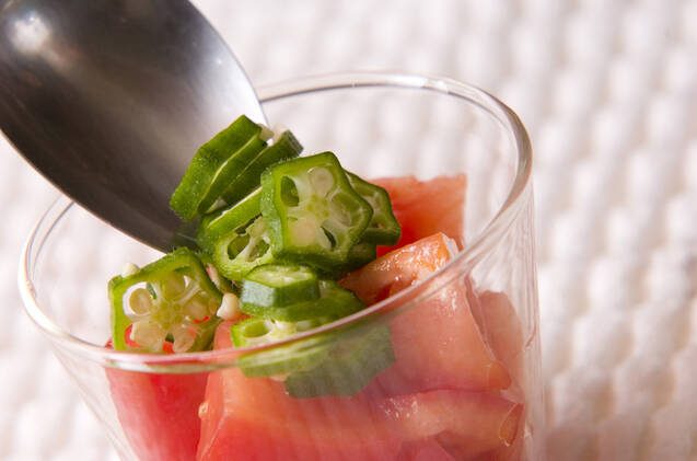 器にトマトを盛り、その上にオクラ、おろしショウガの順にのせ、刻みのりを散らす。 お好みでしょうゆを掛けてどうぞ。