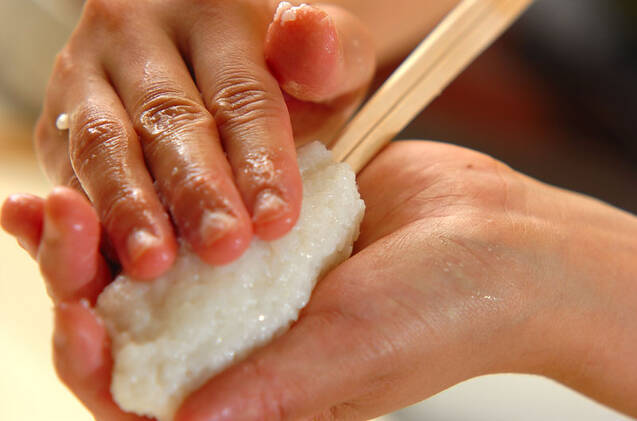 つぶしたご飯を4等分し、そのうちの1つをぬらした手に取って、割り箸に押し付けながら握るようにして丸める。