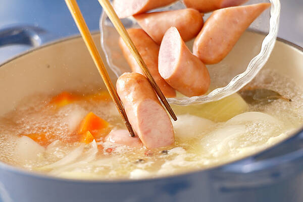 ソーセージ、カブ、ジャガイモを加え落とし蓋をして、鍋の蓋をし15分煮て、ジャガイモが柔らかくなっていればカブの葉を加える。ジャガイモに竹串がスッと刺さればOKです。