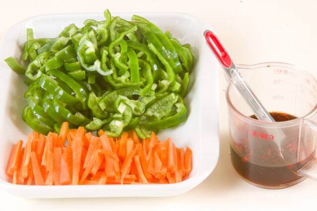 ピーマンは、縦半分に切ってヘタと種を取り、横に細切りにする。