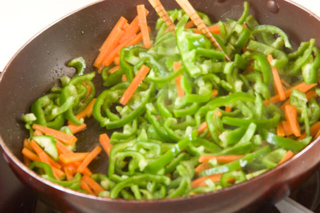 フライパンにゴマ油を強火で熱し、ピーマン、ニンジンを加えて炒める。