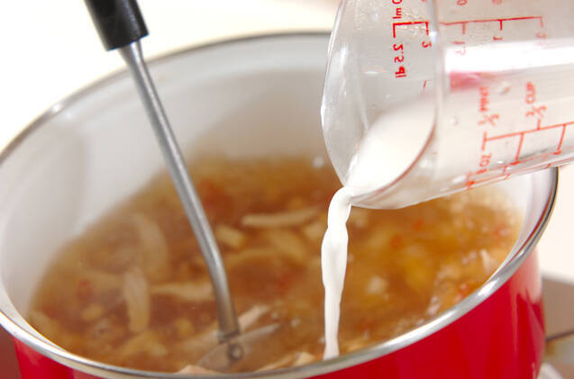 <スープ>の鍋に他のスープの材料を加えてひと煮立ちさせ、<だし溶き片栗>をまわし入れ、トロミがついたら火を止める。