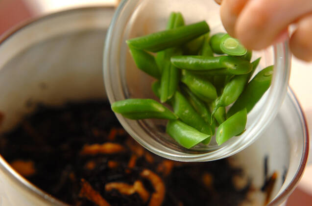 だし汁を加え、煮汁がほとんどなくなるまで中火で煮る。最後にサヤインゲンを加えて混ぜ合わせ、器に盛る。