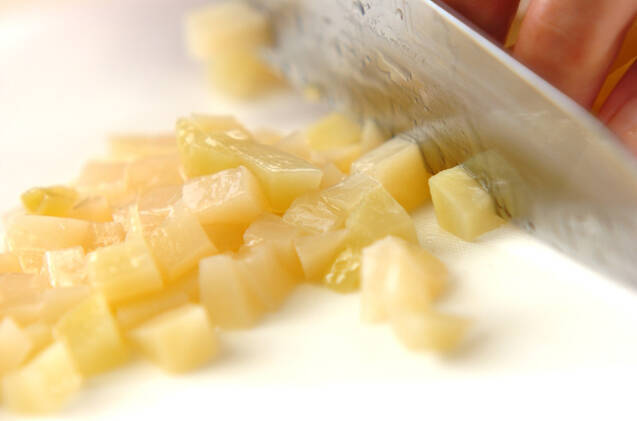 白桃は粗めのみじん切りにする。ヨーグルトと混ぜ合わせ、冷凍庫で冷やしかためる。