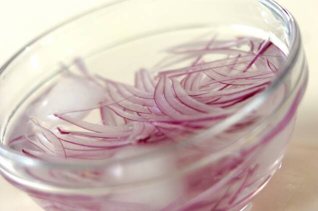白菜を幅5mm位の細切りに、紫玉ネギは薄切りにして冷水に放ち、パリッとしたらザルに上げて水気をきる。