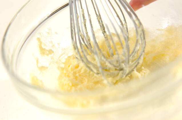 無塩バターは耐熱容器に入れ、電子レンジに10~20秒かけて柔らかくし、砂糖を加えて泡立て器で白っぽくなるまで混ぜ合わせる。電子レンジは600Wを使用しています。<粉類>の材料は合わせて振るっておく。