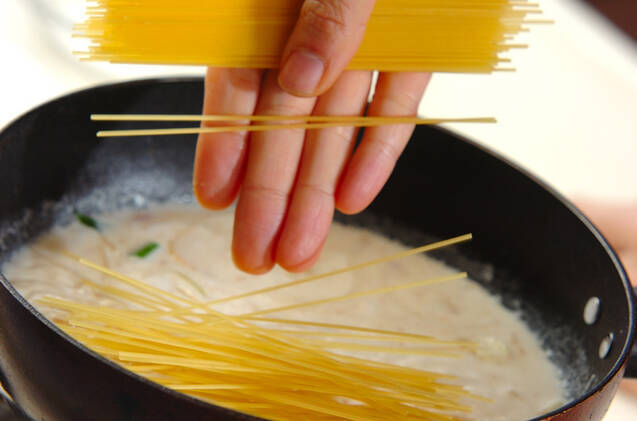 玉ネギがしんなりしたら、牛乳、顆粒スープの素を入れ、煮たってきたらスパゲティーを入れる。