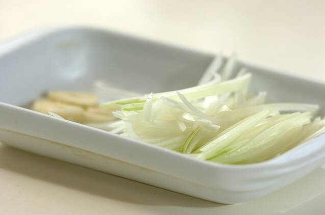 玉ネギは薄くスライスする。ニンニクは皮をむき、薄くスライスする。