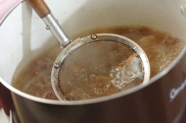 (1)に水300mlを加える。沸騰したらアクを取り、弱火にして6~7分程度煮る。