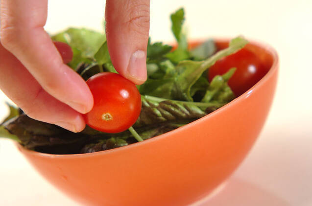 しっかり水気をきった野菜を器に盛り、プチトマトを添える。