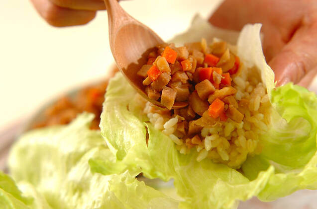 全体に炒められたら<合わせみそ>を加え、煮たってきたら火を弱め、ゆっくり煮飛ばしながら炒め合わせる。器に玄米ご飯、レタスと共に盛り合わせる。レタスに玄米ご飯と高野豆腐みそをのせ、レタスで包んで召し上がって下さい!