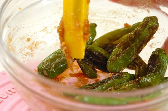 フライパンにシシトウ、ゴマ油を入れて中火で炒める。しんなりしてきたら<ゴマみそ>を合わせたボウルに移してまぶし、器に盛る。