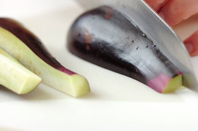 ナスはヘタを切り落として縦4等分に切り、水にさらしてアク抜きをし、水分をきっておく。卵は割りほぐしておく。