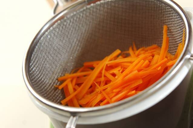 鍋に<ゆでスープ>の材料を強火で熱し、固形スープの素が煮溶けたらニンジンを加え、サッとゆでてザルに上げ、汁気をきって冷ます。