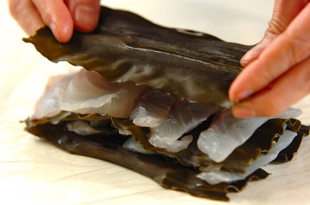 鯛は厚さ5mmの薄切りにし、さっと水に通した昆布に重ならないように並べ、残りの昆布をのせてラップでしっかり包む。冷蔵庫に一晩入れておく。