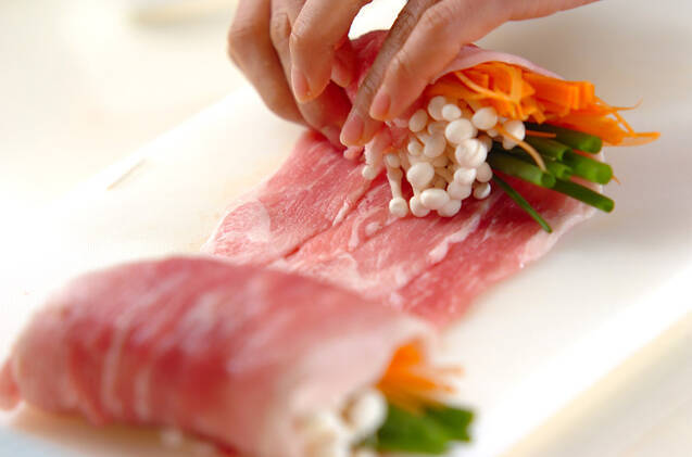 豚もも肉3~4枚を少しずつ重ねて縦長になるようにし、ニンジン、エノキ、細ネギをのせ、手前からしっかり巻く。巻き終わったら片栗粉を薄くまぶしつける。