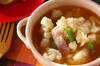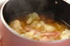 鍋にカリフラワー、玉ネギ、ベーコン、<スープ>の材料を入れて強火にかけ、煮たってきたら蓋をして火を弱め、7~8分煮る。