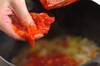 (2)の鍋に水煮トマトをつぶしながら加え、中火にする。水煮トマトの水分が半分くらいになるまで煮詰め、火を止める。