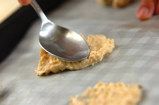 (3)をスプーンですくって天板に間隔をあけて落とし、スプーンを軽く濡らして丸く形を整える。