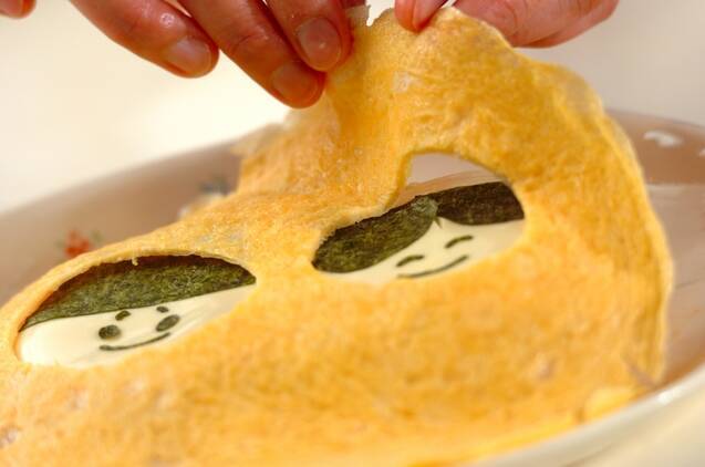 お皿に(3)をよそって<飾り>で顔を描き、(1)をかぶせる。ベビーリーフやプチトマトを添える。