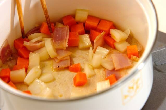 鍋にオリーブ油を中火で熱して、<具材>の材料をじっくりと5分程度炒める。