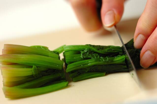 ホウレン草は熱湯でゆでて水に取り、水気を絞る。根元を切り落とし、長さ4~5cmに切る。