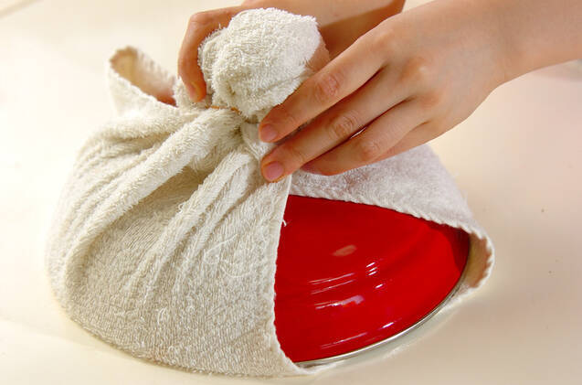 蒸し器を湯気が上がる状態に準備しておく。蒸し器の蓋にタオルを巻き、水滴が茶碗蒸しに落ちないようにしておく。