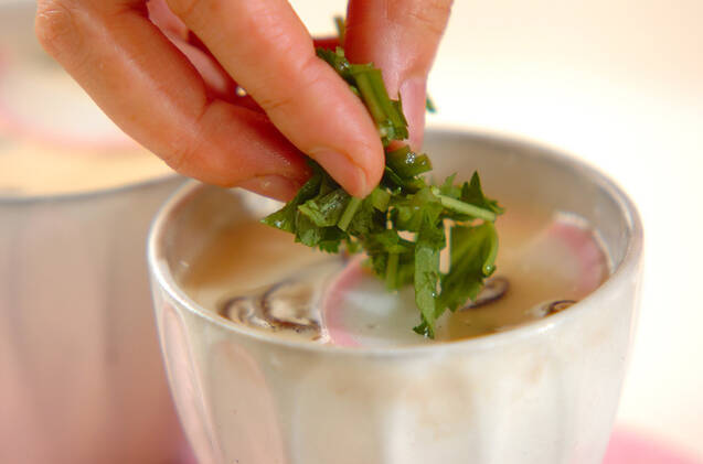 湯気の上がった蒸し器に入れ、強火で1分、弱火で15~20分蒸す(竹串で中央を刺して、澄んだ汁が出たらOK)。最後にミツバをのせる。
