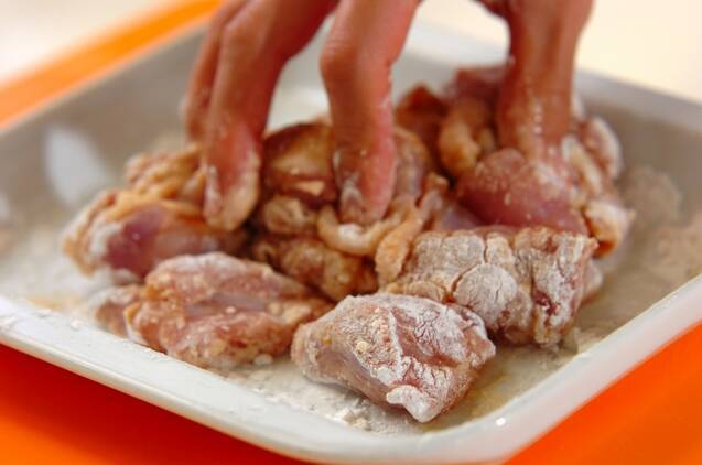 鶏もも肉に混ぜ合わせた片栗粉とコーンスターチを薄くつけ、170℃の揚げ油に入れてカラッと揚げ、油をきる。