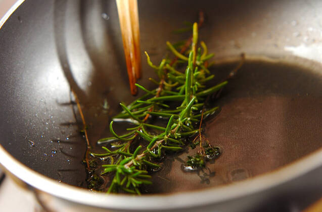 フライパンに分量外のオリーブ油少々を入れ、飾り用のハーブをサッと炒めて取りだす。ピーマンと水洗いしたプチトマトを炒め、ハーブソルトを振る。器に(2)のアジと盛り合わせ、バルサミコ酢をかけてレモン、ハーブを添える。