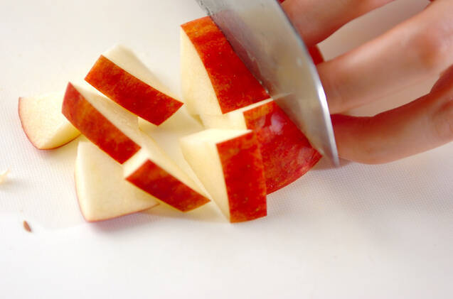リンゴは皮ごときれいに洗い、縦半分に切って芯を取り、幅1cmのイチョウ切りにする。
