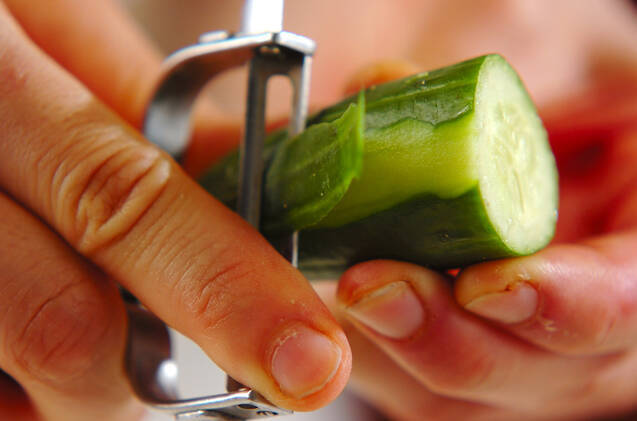 キュウリは端を少し切り落として縦じまに皮をむき、幅5mmの斜め切りにし、サッと水洗いして水気を切る。レタスと合わせ、冷やしておく(縦じまに皮をむくのはピーラーを使うと便利ですよ)。