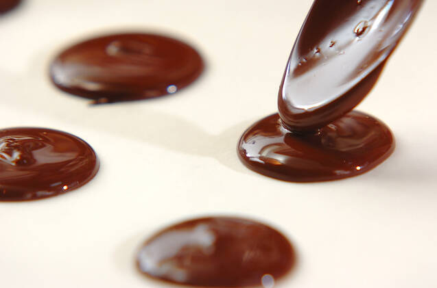 (1)のスイートチョコレートを、クッキングシートの上にスプーンで直径5cm程に丸くのばす。アーモンド、クルミ、オレンジピールをのせてアラザン、スプリンクルを散らし、冷蔵庫で冷やしかためる。