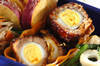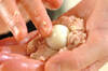 ボウルに<ミートボールのタネ>の材料を入れ、よくこねる。2等分に分け、ウズラの卵を包む。