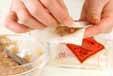 <合わせ種>は皮の枚数分に分け、はがれないようにワンタンの皮に水をつけながら<合わせ種>を包み込む。