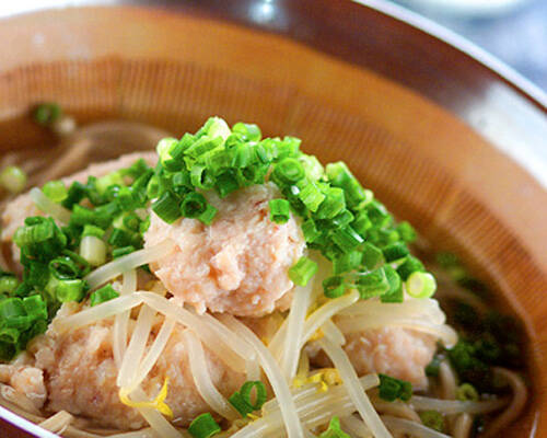 新鮮なイカをさばいて、プリプリの団子にしちゃいます。モヤシも加えてヘルシーに。冷たくひやしたスープがおそばとよく合います。