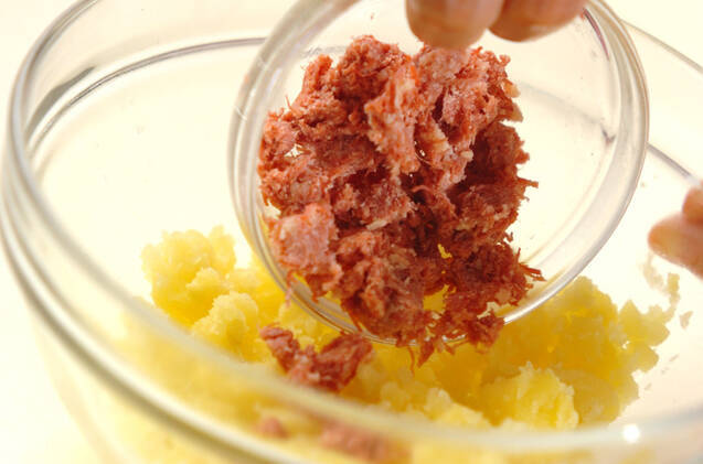 ジャガイモにコンビーフ、カレー粉、塩コショウを加え、混ぜ合わせる。食べやすい大きさに形を整え、小麦粉を薄くまぶす。