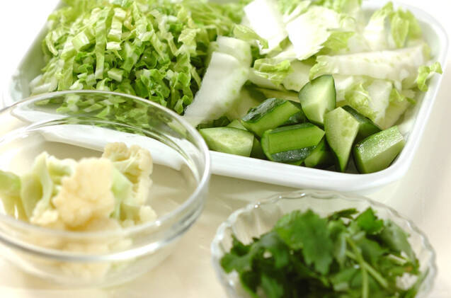 白菜は、軸は食べやすい大きさの削ぎ切りに、葉は細切りにする。