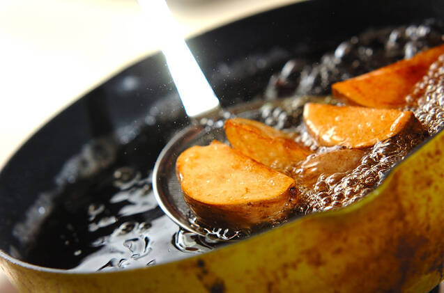 深さのある小鍋または小さめのフライパンにジャガイモを入れ、ヒタヒタまで常温の揚げ油を注ぎ入れ、強火にかける。ジュワジュワと激しい泡がシュワシュワとやさしくなり、少し揚げ色がついたら油から取り出す。